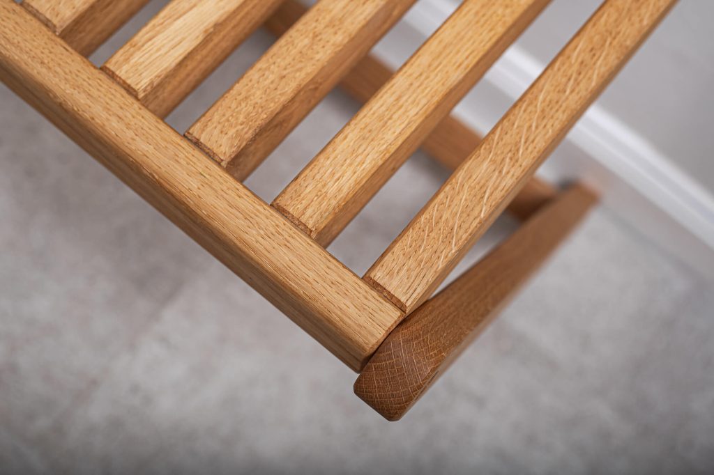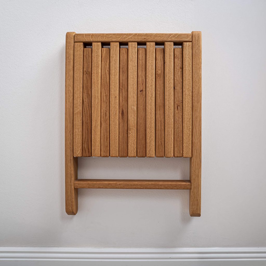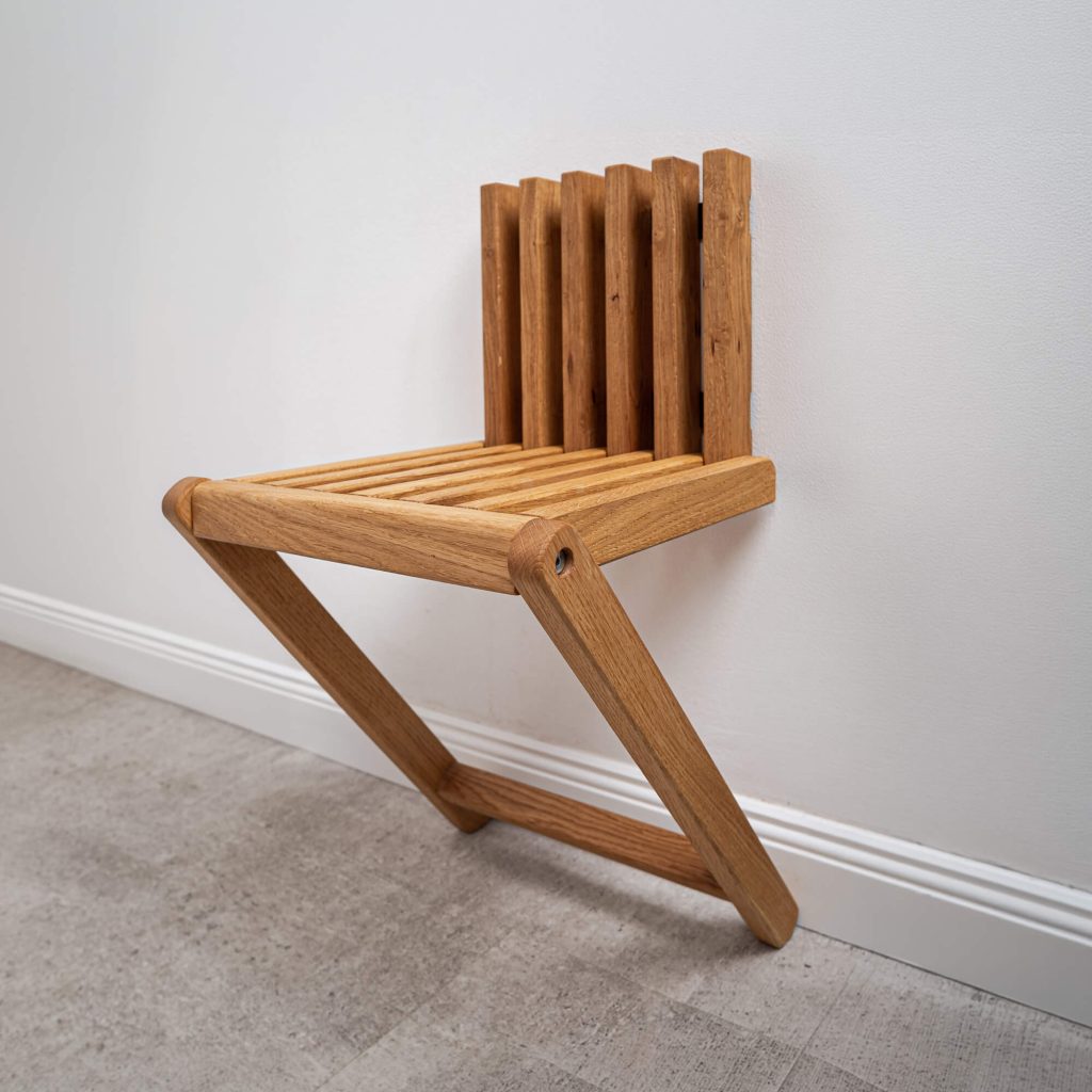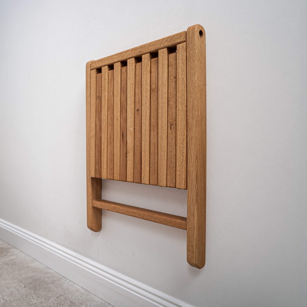 Kézzel készített, lehajtható szék tömör tölgyből. A falra szerelt kialakítás diszkrét és helytakarékos megoldás az előszobában, használatkor viszont azonnal stabil segítséget nyújt. Kényelmes ülőhelyet biztosít felnőtteknek cipőhúzáshoz, és egyszerűbbé teszi a gyerekek reggeli öltöztetését is.