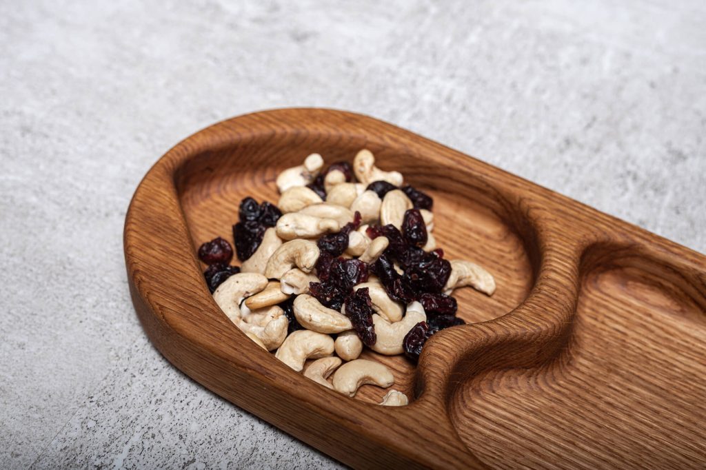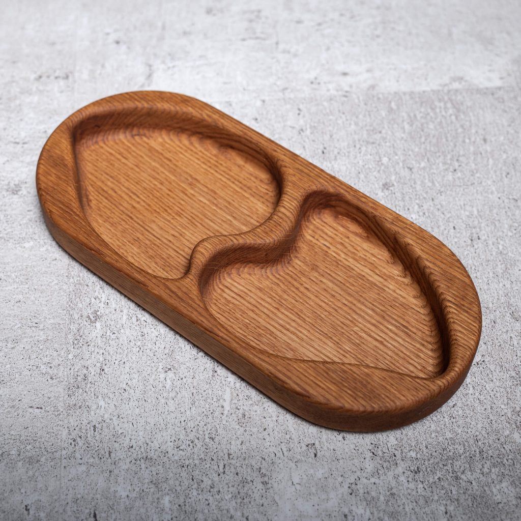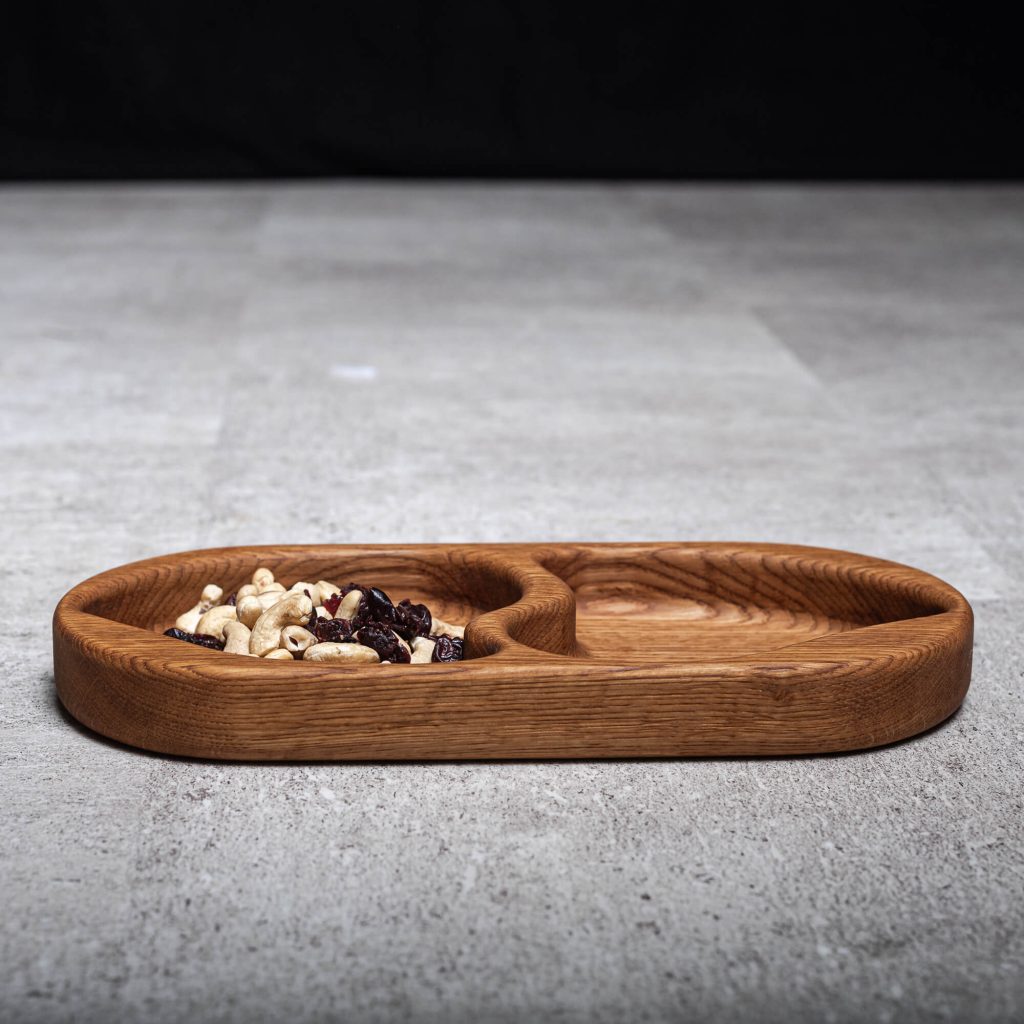 Szív alakú, két rekeszes tölgy tálaló különböző magvak elkülönített tárolására.