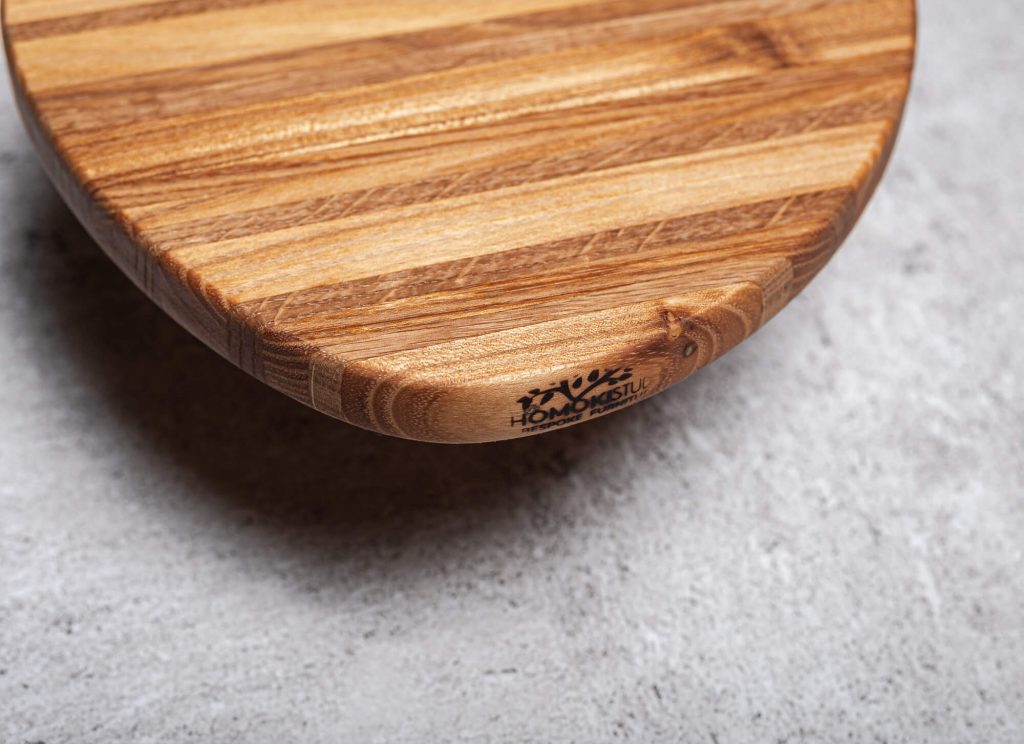 Mérete 21,5 × 21,5 cm, vastagsága 17 mm. A deszka kézzel csiszolt, sima felületű, majd több rétegben 100%-ban élelmiszerbiztonságos olajjal és viasszal kezelt, hogy szép maradjon.